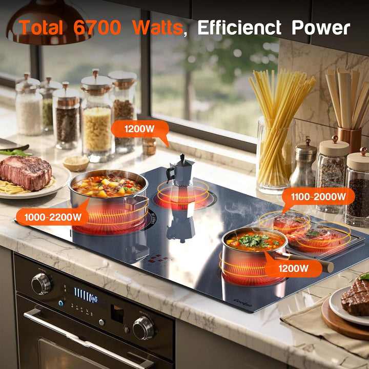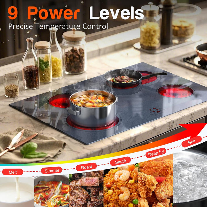 - 【Safety and Convenience Stovetop】Beyond the safety lock and 99 min timer, Cooksir 4 burner electric cooktop is designed with a range of safety and convenience features to make your cooking experience enjoyable and worry-free. It includes residual heat indicator that displays whether the burners are still hot after use, thus preventing accidental burns. Furthermore, it's also designed for easy cleaning with its smooth glass surface, making the post-cooking clean-up a breeze. All in all, this 30 inch electric cooktop delivers a blend of superior performance, versatility, safety, and convenience.