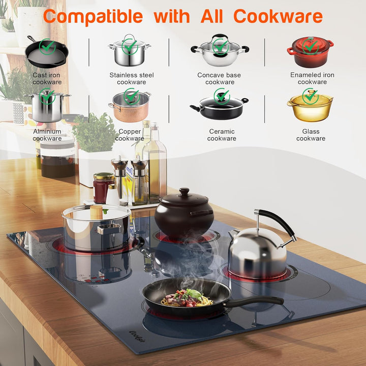 - 【Suitable for All Types of Cookers】Cooksir electric stove top can be used with any type of cookware in your home, such as aluminium pans, copper pans, cast iron frying pans and non-magnetic stainless steel pans. But please make sure that the the bottom of the cookware should be flat. Cooksir 30 in 4 burner ceramic hob can heat your dishes efficiently with minimal heat loss. Product Size: 30.3"D x 20.5"W x 1.7"H.