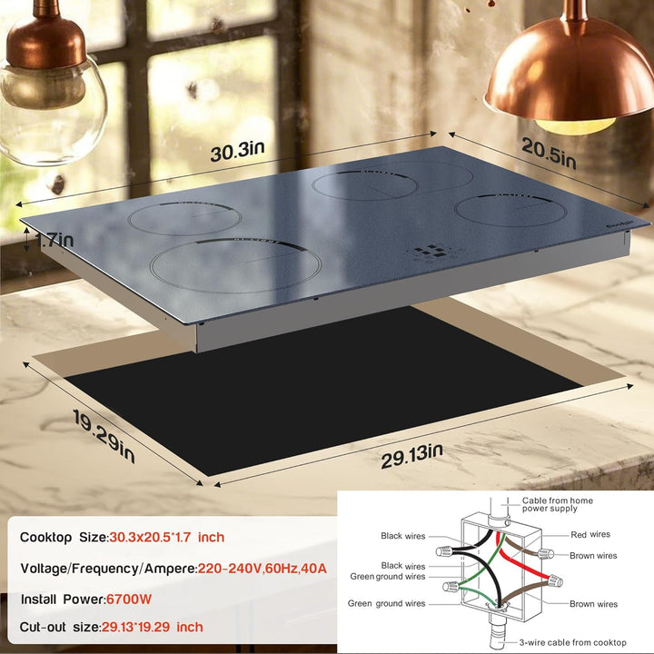 - 【220-240v 6700W High Power】This 30 inch electric cooktop is suitable for AC220-240V, featuring 4 different cooking zones with total power 6700W. The top left 6.5"(165mm) round cooking zone has a maximum 1200W power; the lower left 9.1"(230mm) zones have a maximum 2300W power; the top right 6.5"(165mm) round cooking zone and 10.6"(270mm) oval zone have a maximum 1100W and 2000W power respectively; The lower right 6.5"(165mm) round cooking zone has a maximum 1200W power. Built-in Ceramic Hob 220-240v hard wired, need a professional electrician for wiring.