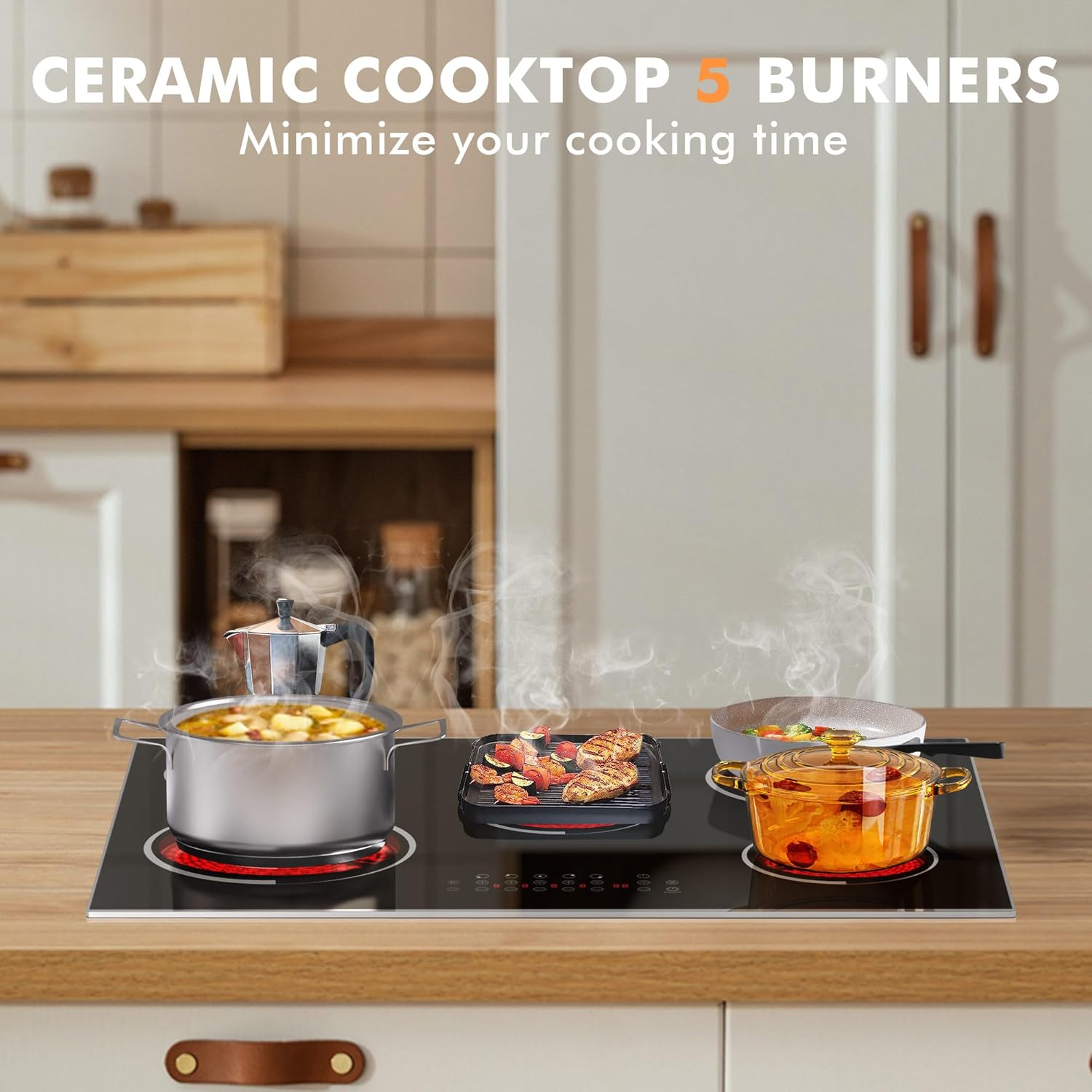 - 【Multifunctional Electric Cooktop 5 Burners】If you don't like those knob model electric cooktop, you can try our sensor touch control electric cootkop, which has more function that help cooking, such as 99-minute timer, auto shut-off, safety lock, high temperature warning, overheat protection, pause function, etc. Our 30 inch electric cooktop with these features not only make your cooking easier but also protect your safety better.